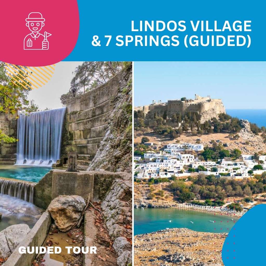 Experience a full-day guided excursion combining nature, history, and traditional island charm. Your journey begins at Seven Springs, one of Rhodes’ most scenic natural spots, where shaded forest paths, wooden bridges, flowing streams, and a small lake create a peaceful setting away from the summer heat. You can explore the area on foot, relax at the café, or, if you wish, walk through the narrow 186-meter tunnel leading to the lake.