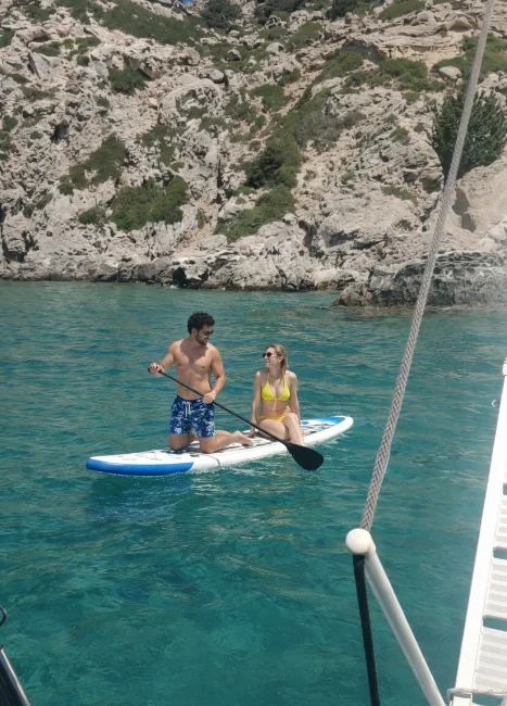 Next, the yacht sails to the iconic Anthony Quinn Bay, famous for its emerald waters and dramatic natural beauty. This extended stop allows plenty of time for swimming, snorkeling, paddleboarding, and relaxing in one of the most beautiful bays on the island.